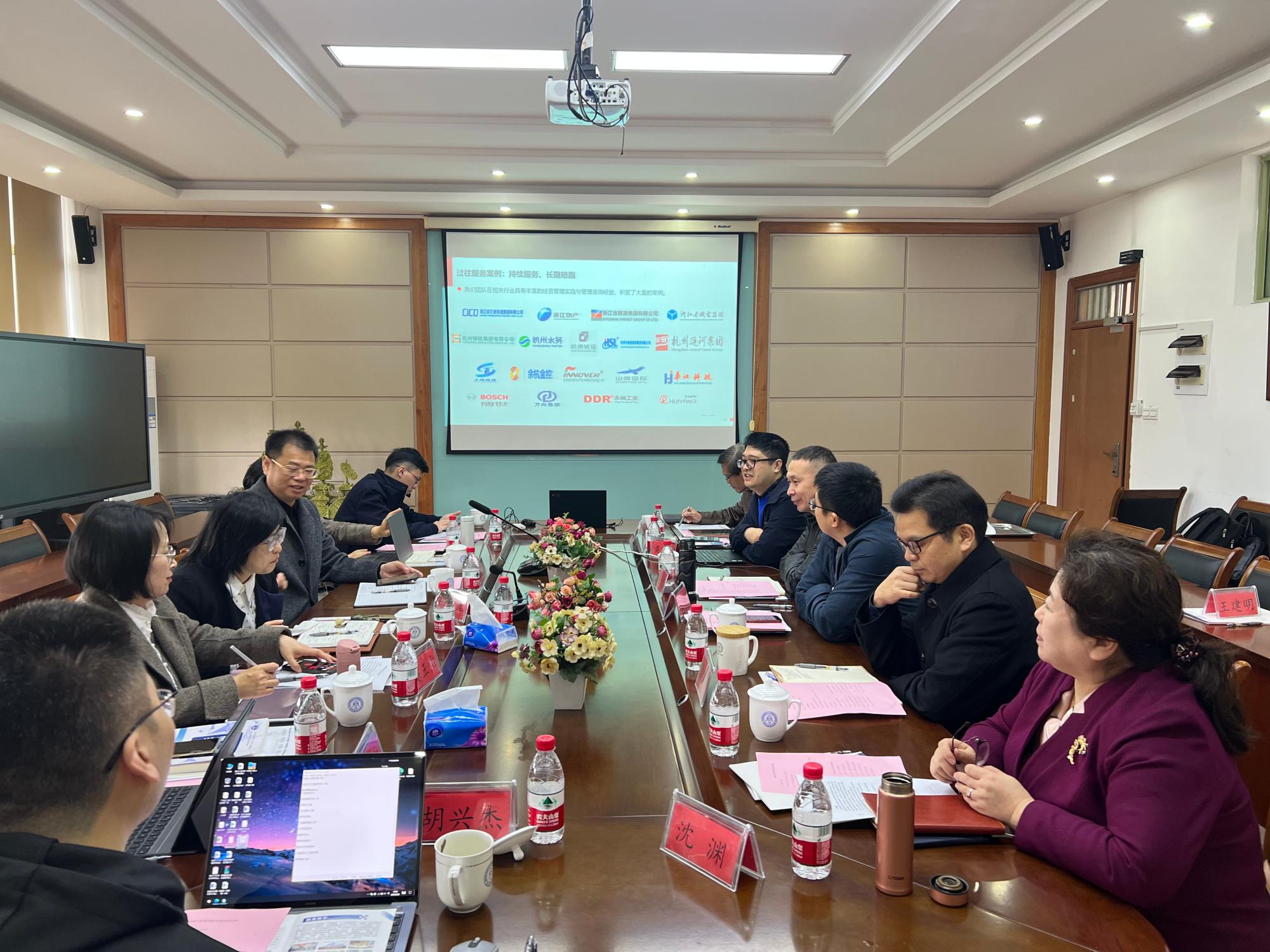 进行调研,学院院长王建明、教学副院长张雷、院党委成员郭军灵、企管系教工支部书记包兴、数智管理创新班执行人沈渊、EDP培训中心主任黄纯、企管系教师赵昶等人在学院410会议室进行了交流。