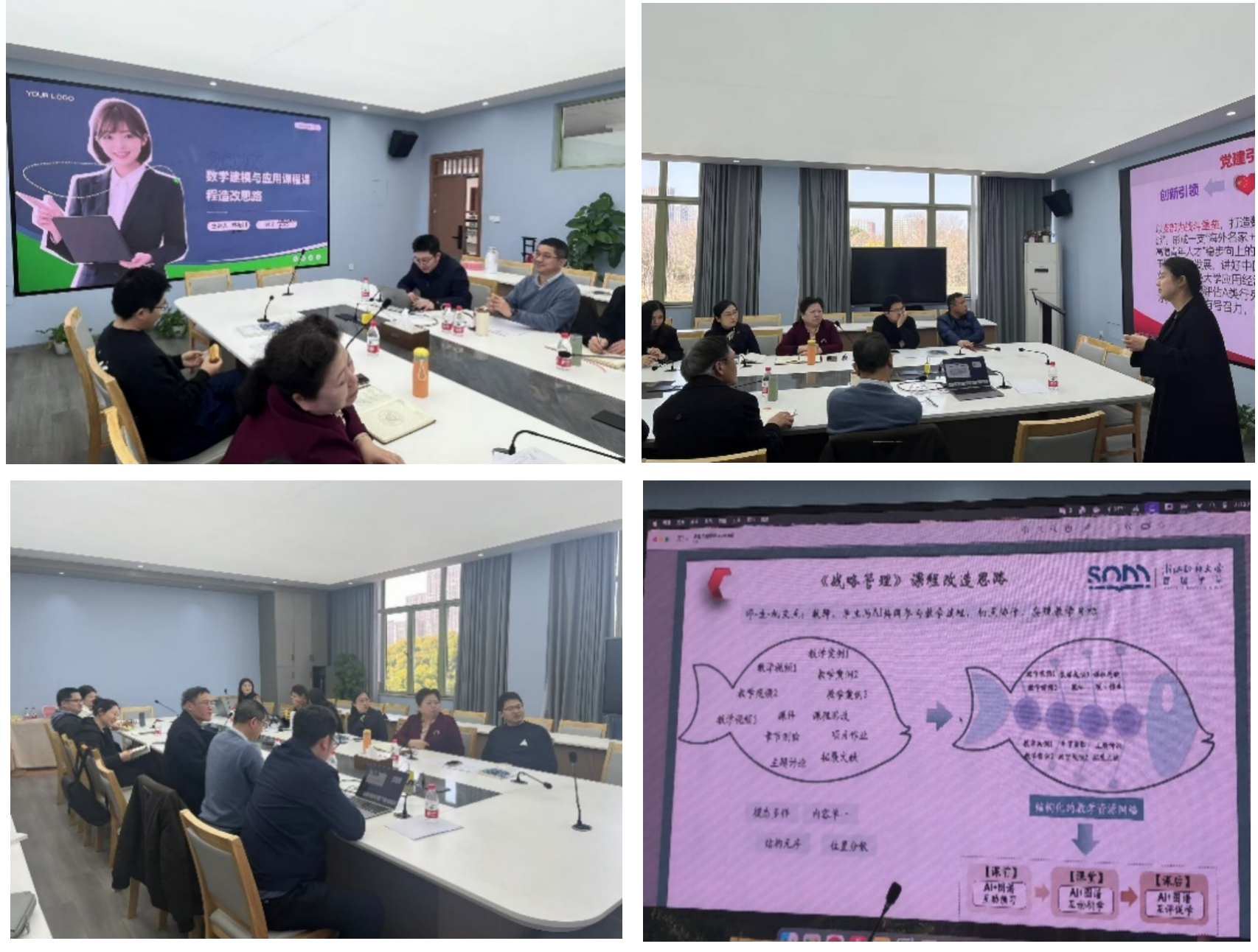 朱书记首先介绍了学院正在推进的专业调整工作,明确了学院新的人才培养目标,为后续的专业改造工作指明了方向。随后林与川老师分享了《数学建模与应用》课程的建设情况。林老师详细阐述了从教学安排、考核评价,到拟开设的交叉活动以及课程资源建设等多维度的课程改进思路,尤其重点探讨了如何巧妙借助AI工具辅助教学,引发了在场老师们的热烈讨论。紧接着,俞萍萍老师介绍了《战略管理》课程在“AI+”方向的改造思路,创新性地提出构建结构化的教学资源网络,以及打造“AI+”图谱的互助模式。针对这一思路,相关老师积极建言献策,提出了诸多宝贵建议,帮助进一步梳理课程设计目标和教学建设内容,为课程改造提供了有益方向。