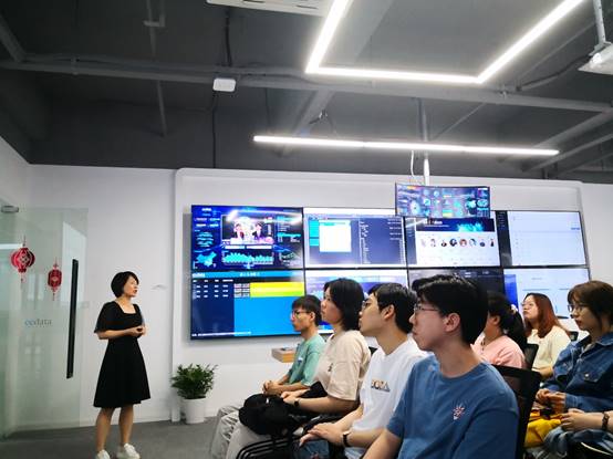 抵达ccdata公司后,融媒中心总监徐珍女士在会议室中为师生们详细地介绍了ccdata近些年来所开发与运行的多项新产品新技术。如网联数科所采用的DMP数据标签基于大数据进行消费者画像识别,其包含的消费者标签多达上百个甚至更多,从消费者的购买偏好到资产分布都有所涉及,为消费者画像提供了具体而细致的信息。ccdata所建立的融数平台能够帮助广电机构了解其自身的新媒体融合传播能力,作为频道及节目运营时外宣数据支撑,同时,融数平台对于不同品牌而言也能够帮助其选择影响力大、带货能力强、公信力好的KOL主播来营销带货种草。可以说融数平台为与新媒体相关的多方客户提供了一站式的服务与帮助。徐珍女士还为我们演示了网联大屏监测网所展示的实时终端设备使用情况,还有智能语音主播所发出的与真人主播几乎无异的天气播报与路况播报等语音,让在座的师生们赞叹连连。