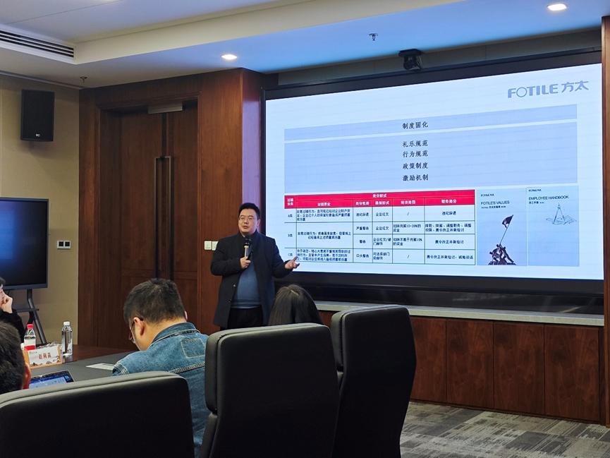 范斌院长就企业发展史、香蕉视频、员工培养体系等方面展开汇报。企业发展史方面,范院长以形象生动的语言讲述了第一代企业家茅理翔先生创建方太集团前身飞翔集团的过程,以及第二代企业家茅忠群先生带领方太集团化解危机,并最终成为行业引领者的历程。香蕉视频方面,范院长向调研团队详细解读了“博传统文化之长,兼经营管理之实”的方太集团的组织文化,即“中学明道、西学优术、中西合璧、以道御术”。员工培养方面,范院长指出员工教育的目的是激发员工的工作激情,教育的本质是倡导员工修身心、尽本分,做到五个“一”,即“立一个志,读一本经,改一个过,行一次孝,日行一善”。范院长总结道:“今天方太文化的道是以顾客为中心,以员工为根本。快乐学习,快乐工作,促进人类社会的真善美。”