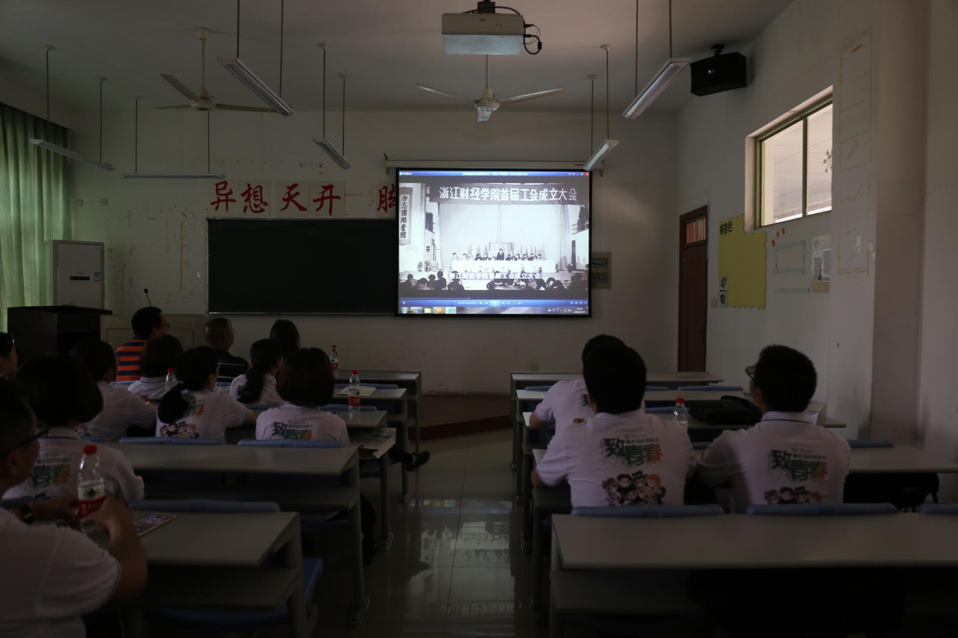 随后在学院楼110教室进行了02级校友特殊的主题班会。校友们齐聚一室,找到当年熟悉的同桌,重温当年的记忆。班会首先安排的是观看浙财大的纪录片,用影像回忆浙财的过去。在观影过程,有几位校友激动地指出:“那是醉墨池,我以前经常去”,一下子引起了其他同学的共鸣。