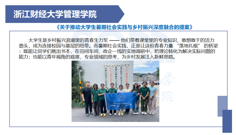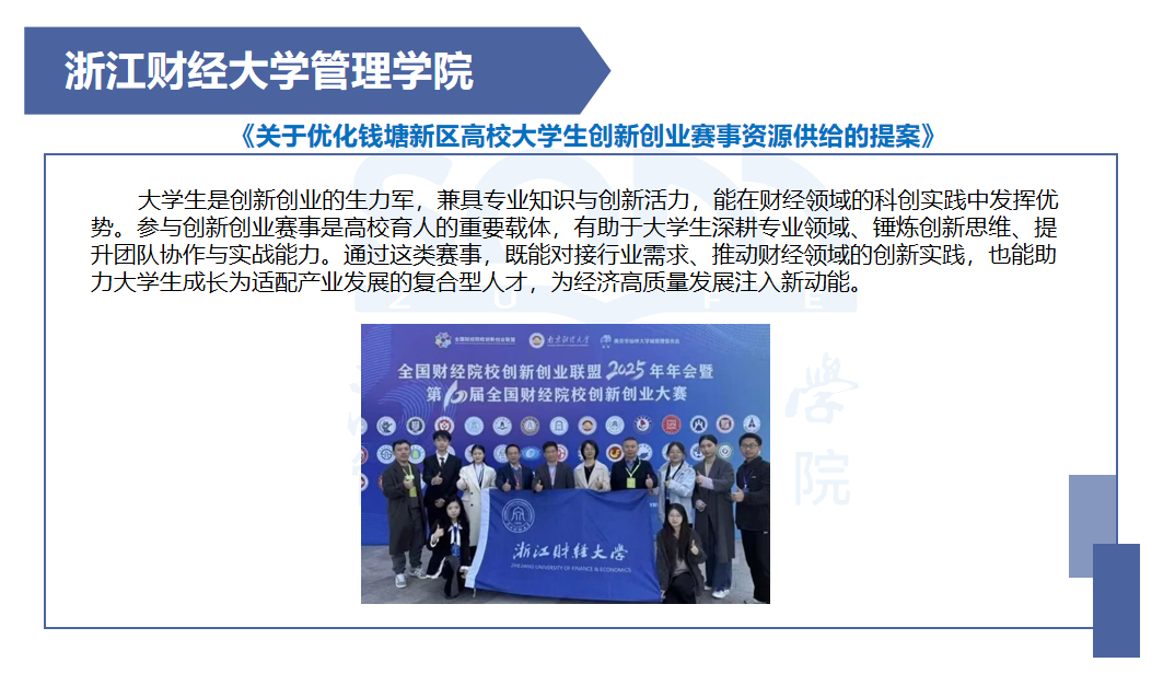 经过前期讨论与初步筛选,其中《关于优化钱塘新区高校大学生创新创业赛事资源供给的提案》和《关于推动大学生暑期社会实践与乡村振兴深度融合的提案》两份提案,因选题贴近实际、调研较为深入荣评优秀提案。同学们在提案中展现了将个人成长与区域发展相融合的视野,也体现了当代青年参与社会治理的热情与潜力。