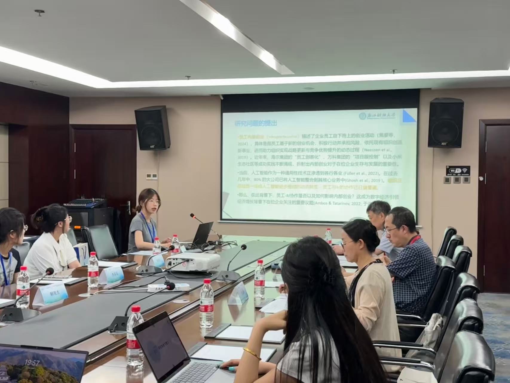 2023级硕士研究生胡亚冰与导师戴维奇教授合作的论文《员工-AI协作对员工内部创业的影响机制研究》受邀汇报。该论文基于工作要求-资源模型,探究员工-AI协作对员工内部创业行为的影响及其作用机制。该研究以更加综合的视角剖析并验证了员工-AI协作影响内部创业的具体过程,对企业管理者合理评估AI应用、安排AI使用计划具有启发意义。