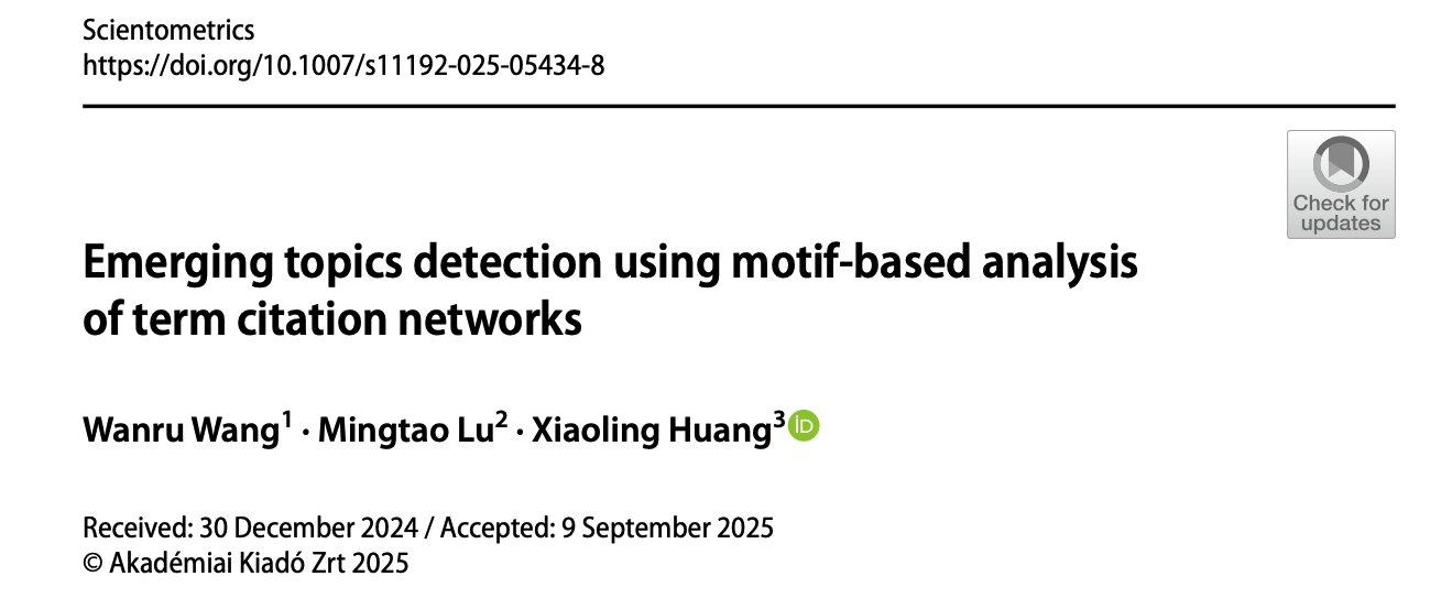 图书馆黄小玲老师合作完成的论文“Emerging topics detection using motif-based analysis of term citation networks”在国际期刊Scientometrics在线发表。Scientometrics是一本专注于信息计量学与科学计量学的国际学术期刊,2025年影响因子为3.5,属于信息资源管理领域JCR一区、FMS-B类期刊。该论文的工作受到了国家自然科学基金青年项目的支持。