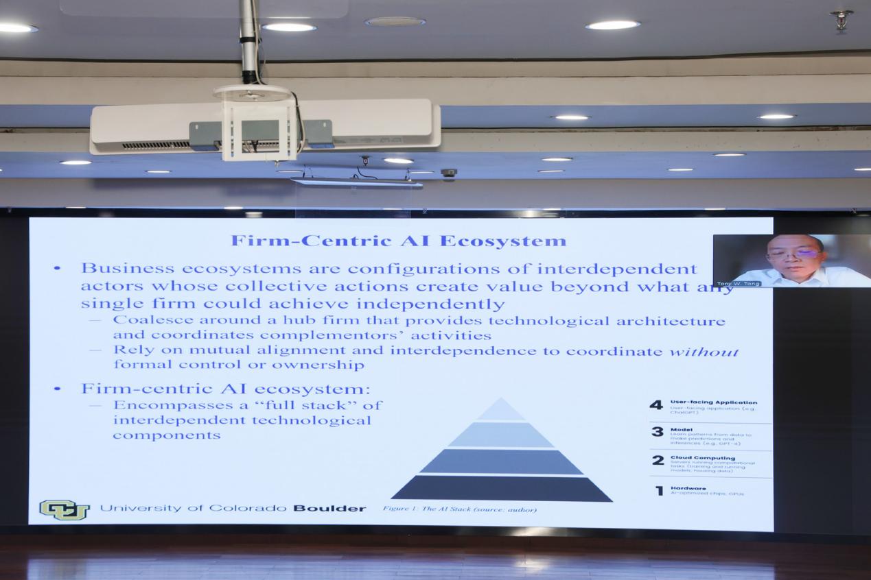 童文锋教授以“全球人工智能竞争背景下国家人工智能生态系统的崛起”为题进行了线上报告。他在报告中提出了一个以国家人工智能生态系统为中心的新框架,探讨了企业在AI时代战略定位的重要性,指出企业可通过融入AI生态系统来创造价值,认为国家的积极作为正在推动以企业为中心的生态系统整合为更广泛的配置,以符合国家的战略目标。他还分析了全球范围内AI技术的竞争与合作态势,以及地缘政治因素如何塑造AI生态系统的构建,强调企业的成功不仅是依赖于传统的资源,而且还依赖于对生态系统的编排。