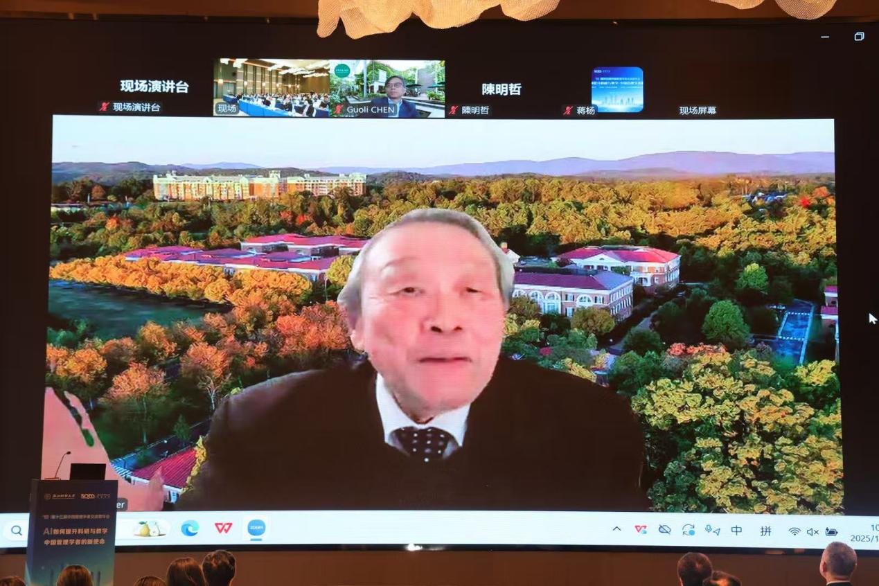 陈明哲教授以“于变局中安身,在学术中立命”为题作线上报告。他结合杭州从阿里巴巴到如今“杭州六小龙”引领全球科技潮流的生动案例,指出杭州的创新实践正是“变”与“不变”的生动注脚,进而提出杭州应立足历史文化与东方智慧,打造“世界的杭州”而非“中国的硅谷”的愿景。谈及管理学者的角色定位,陈明哲教授提出“企业士”概念,强调负责任的学者是负责任学术研究的前提,呼吁学者兼顾研究、教学与服务,以“修己安人”为目标,在变局中坚守初心。最后,陈明哲教授以“行者自达”与参会学者共勉,鼓励大家以“用心深细”的态度深耕学术,以“和而不流”的智慧应对变局,在文化承传与理论创新中承担双重责任,为管理学科发展与人类共同价值创造贡献力量。