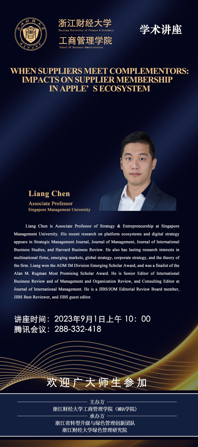 【讲座预告】Liang Chen副教授:When Suppliers Meet Complementors: Impacts on Supplier Membership in Apple’s Ecosystem
