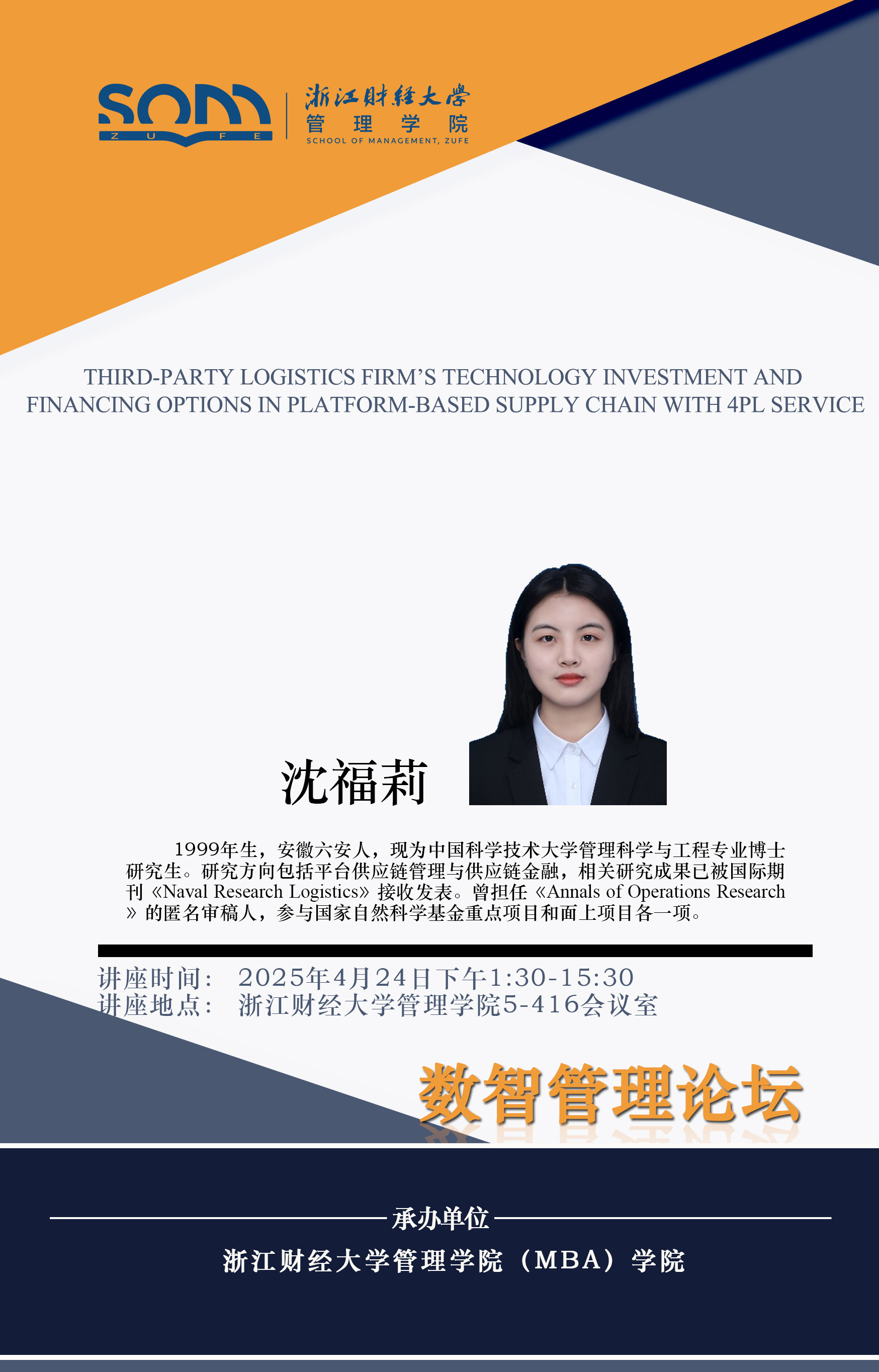 香蕉视频 新财经战略系列学术活动2025年第17期【学术报告】沈福莉:Third-party logistics firm’s technology investment and financing options in platform-based supply chain with 4PL service (第三方物流企业技术投入和融资策略研究)