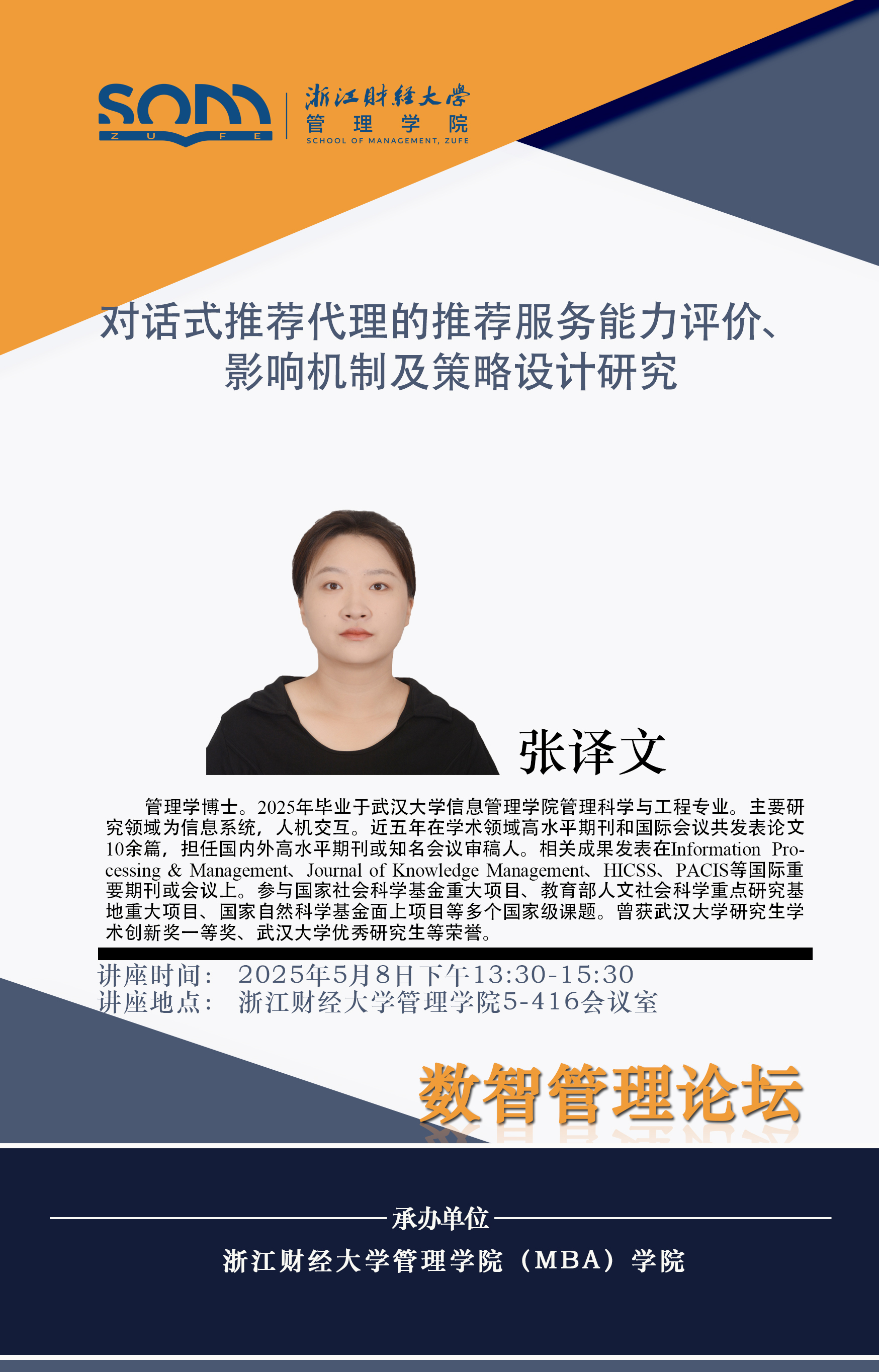 香蕉视频 新财经战略系列学术活动2025年第32期【学术报告】张译文:对话式推荐代理的推荐服务能力评价、影响机制及策略设计研究