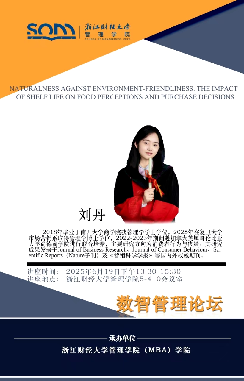 香蕉视频 新财经战略系列学术活动2025年第42期【学术报告】刘丹:Naturalness against Environment-Friendliness The Impact of Shelf Life on Food Perceptions and Purchase Decisions