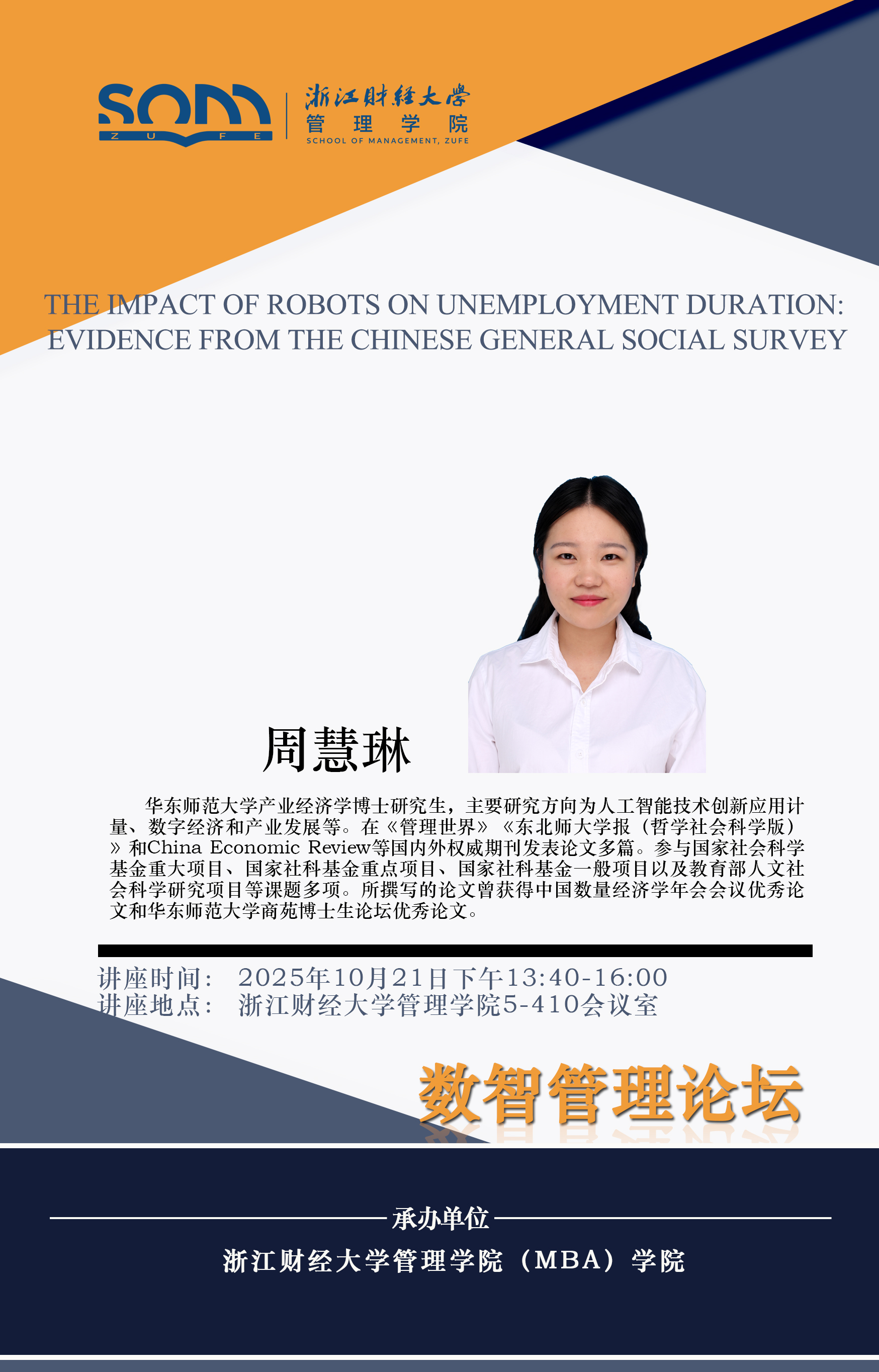香蕉视频 新财经战略系列学术活动2025年第56期【学术报告】周慧琳:The Impact of Robots on Unemployment Duration Evidence from the Chinese General Social Survey