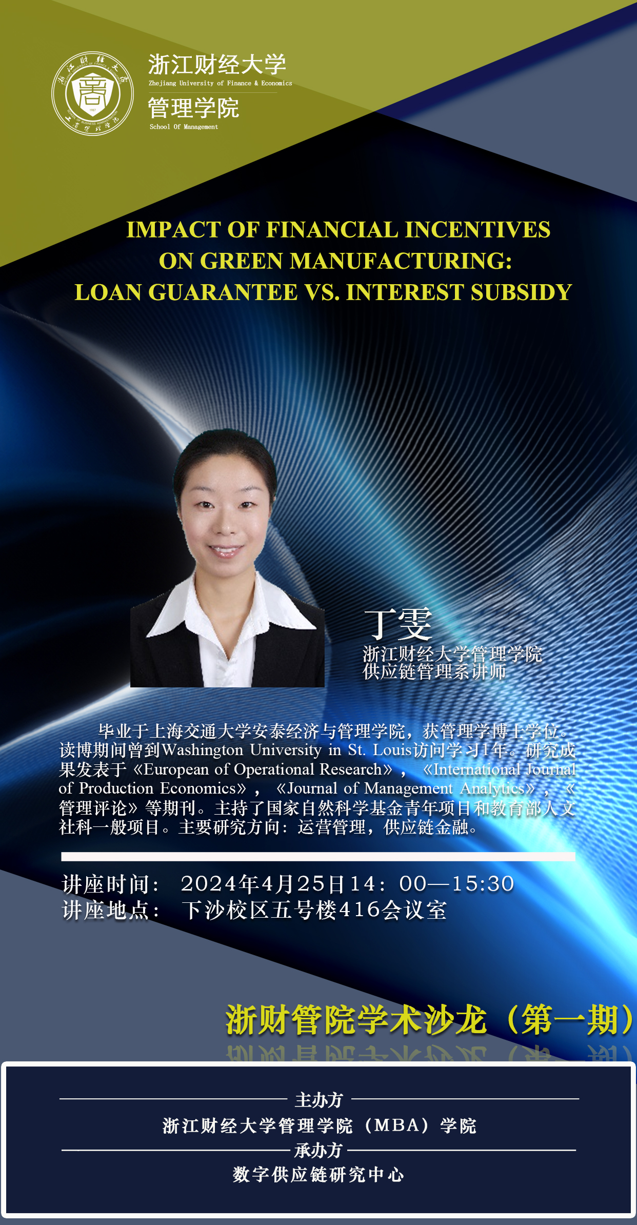 【浙财管院学术沙龙(第一期)预告】丁雯:Impact of financial incentives on green manufacturing: Loan guarantee vs. interest subsidy