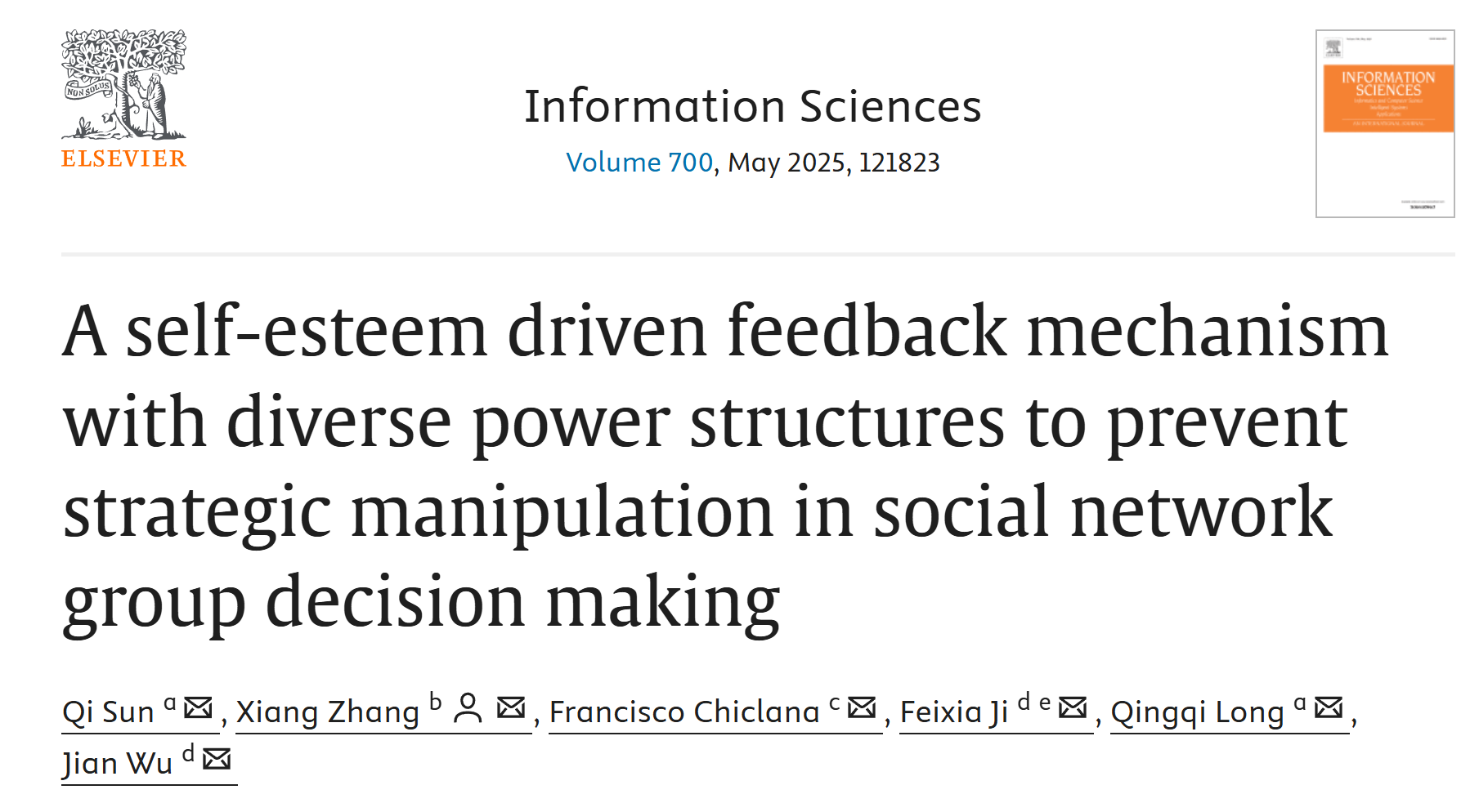 Q. Sun X. Zhang, F. Chiclana, F. X. Ji, Q. Q. Long, J. Wu. A self-esteem driven feedback mechanism with diverse power structures to prevent strategic manipulation in social network group decision making, 2025, 700: 121823.