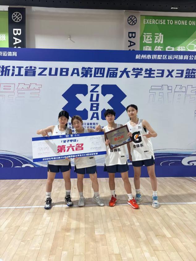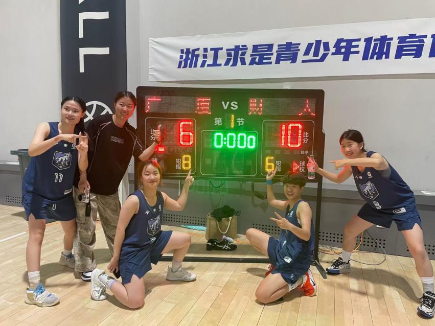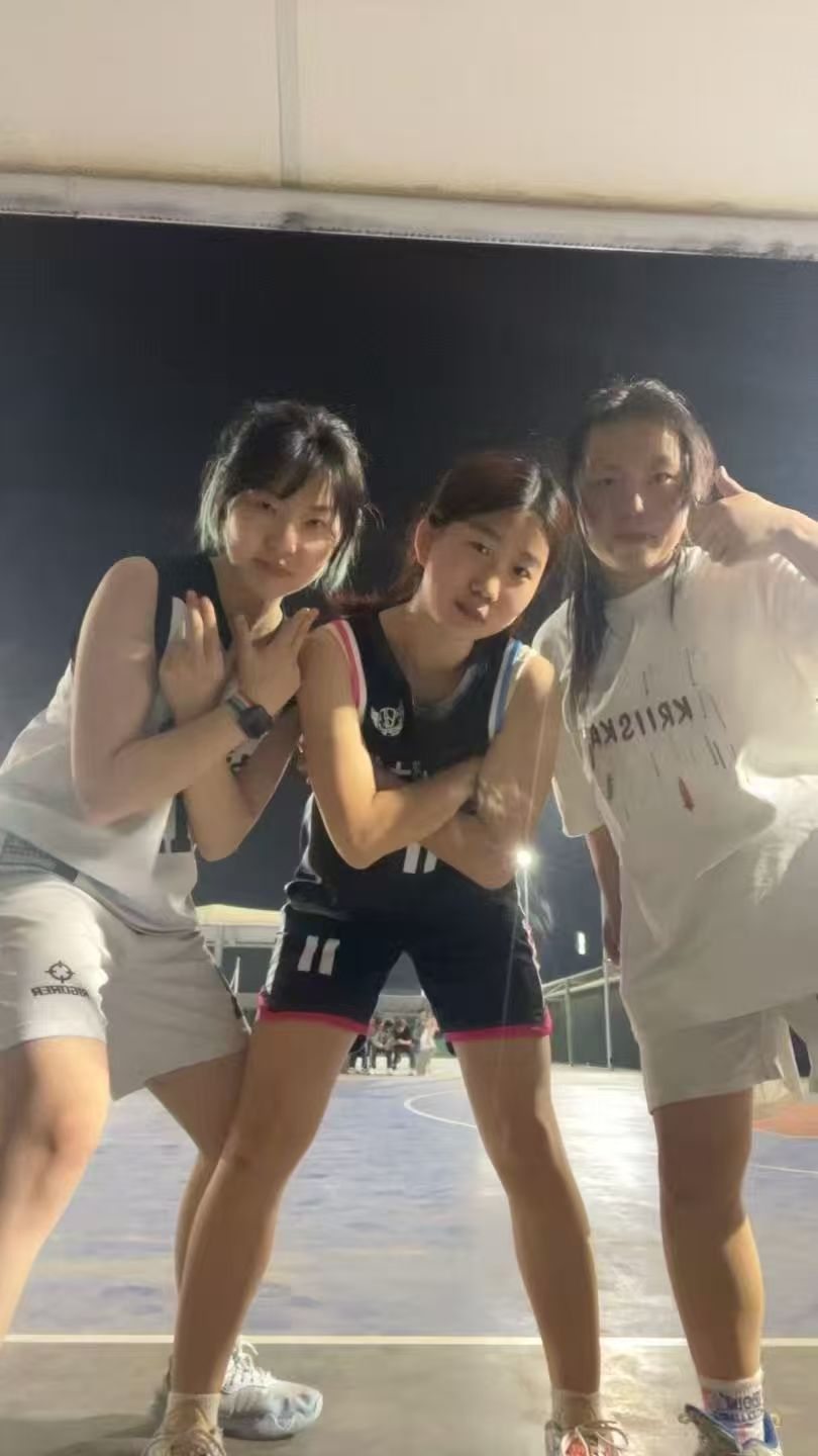 张子珮(右一)与篮球队队员一同参加篮球赛